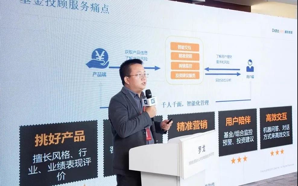 Luo Ge, chief intelligent investing scientist of Datayes, delivered a speech in which he presented the technology and application of fund investment advisor at the conference. He said that with the expansion of pilot fund investment advisors, the wealth management service is changing from seller-model towards buyer-model, that is, providing individualized professional services according to the needs of clients. It also serves clients in the whole process of investment from the start to the finish. Therefore, asset management companies need to enhance its two core capabilities: Know Your Product (KYP) and Know Your Customer (KYC).